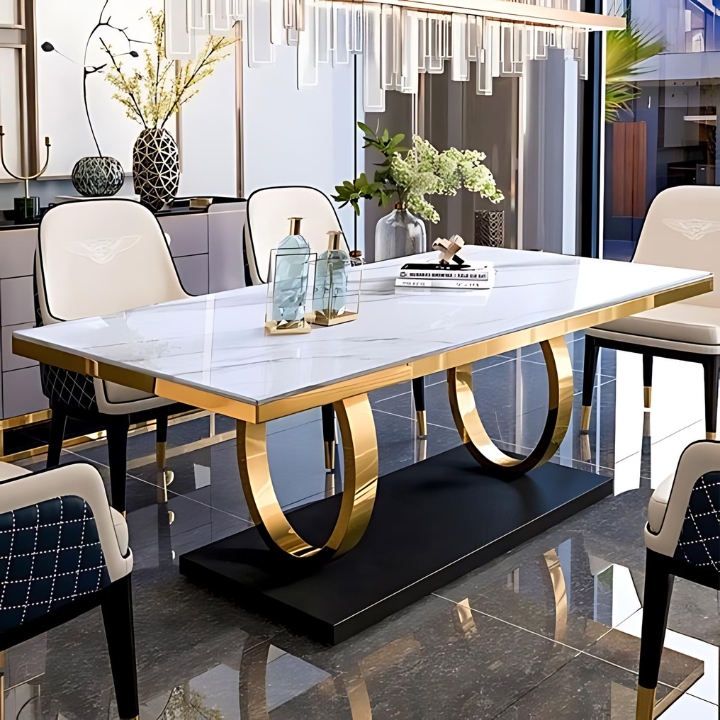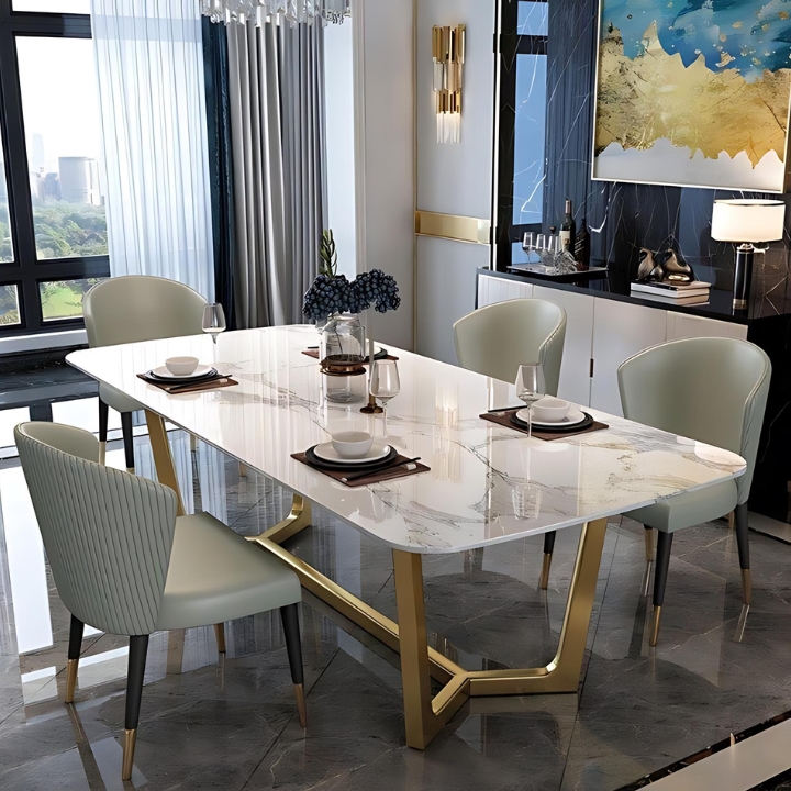 The Marble Grandeur Dining Table showcases a pristine white marble top with elegant veining, set on a sleek gold-finished base. Paired with plush curved chairs, it brings modern sophistication and luxurious comfort to your dining space.