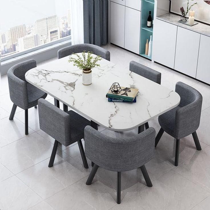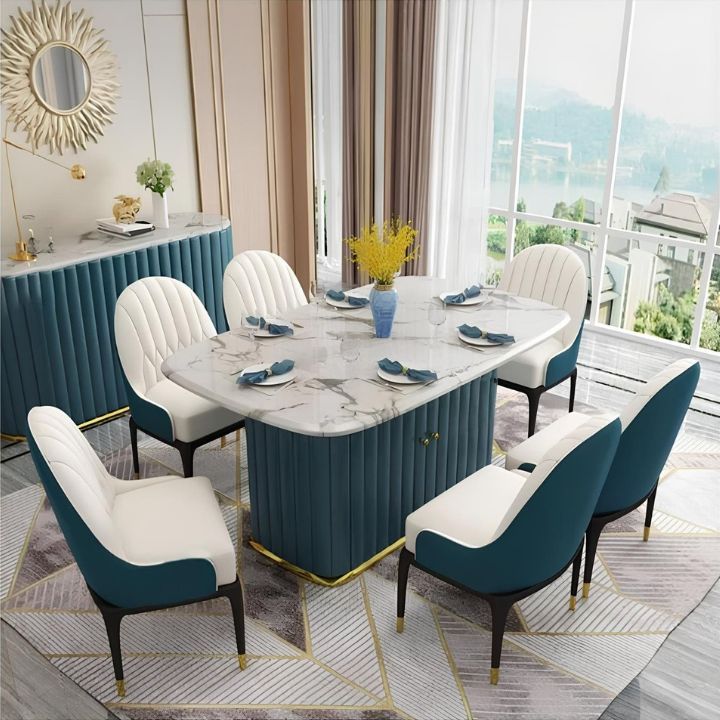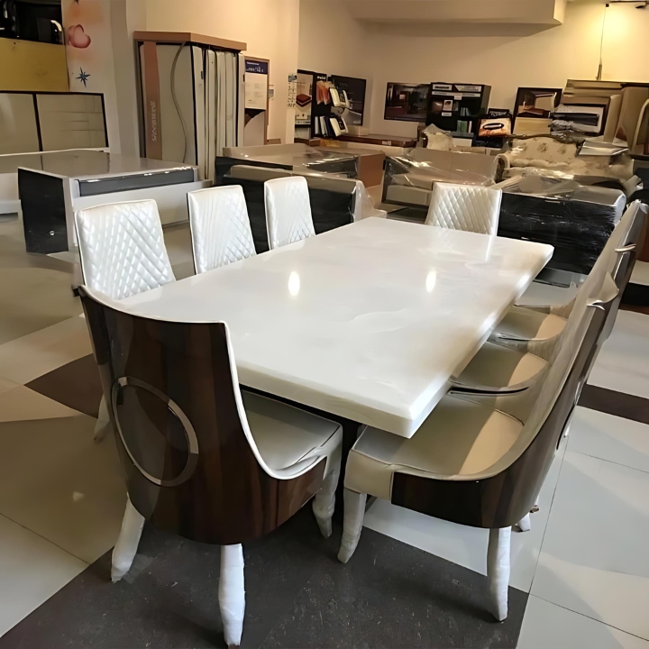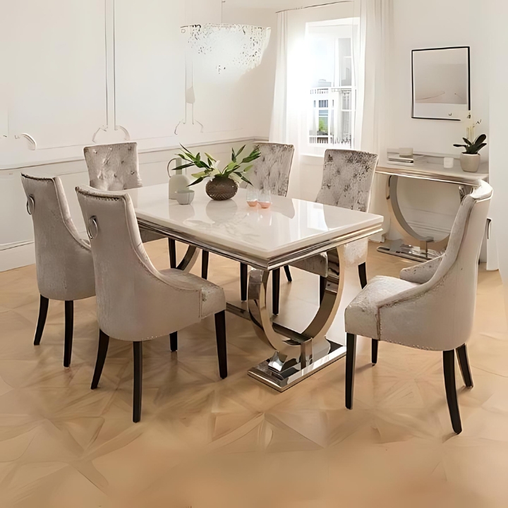 The Classic Serenity Dining Table pairs a polished marble top with rounded edges and a sturdy wooden base, radiating timeless elegance. Completed with plush dual-tone high-backed chairs, it blends comfort and sophistication for your dining space.