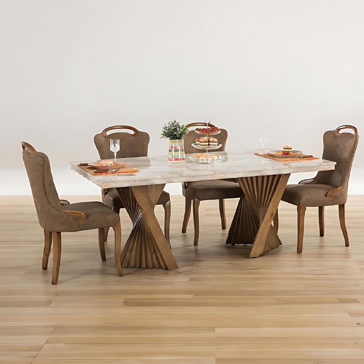 The Regal Harmony Dining Table pairs a luxurious marble top with intricately carved wooden pedestal bases, blending elegance and stability. Completed with vintage-style plush chairs, it adds a timeless charm to any dining space.
