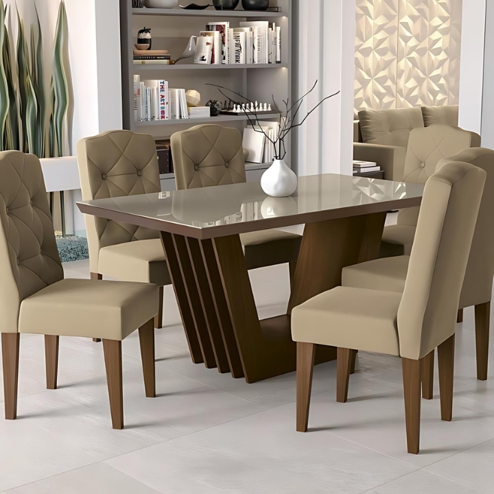 This elegant dining set features a sleek glass top paired with a sturdy walnut-finished base. Accompanied by luxuriously tufted beige chairs, it combines timeless sophistication with comfort, perfect for both casual meals and formal dining.