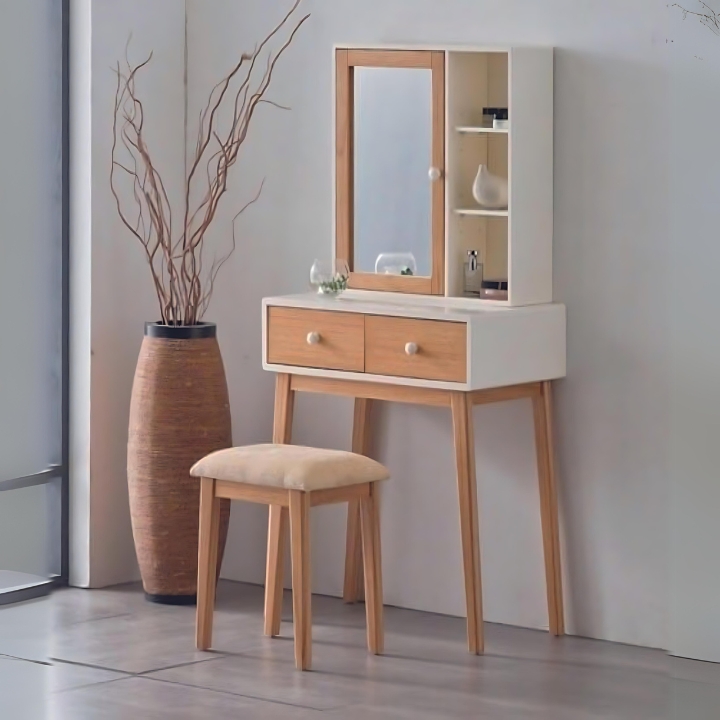 Exclusively at Teak House, the Scandinavian Charm Dressing Table blends functionality with minimalist design. With a compact mirror, open shelving, and ample drawer storage, its light wood and white finish bring a fresh, airy vibe to any bedroom.