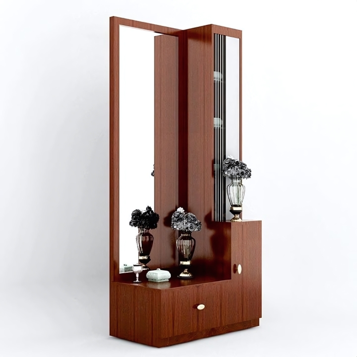 Exclusively at Teak House, the Regal Splendor Dressing Table features a tall full-length mirror, polished wood frame, and intricate detailing. With built-in shelves for ample storage, its warm wood finish adds timeless elegance and functionality to any bedroom.