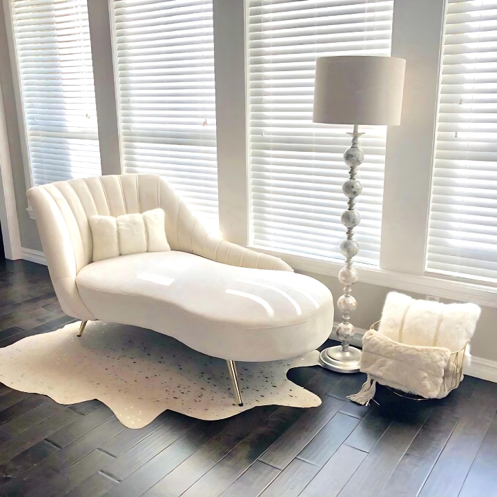 Luminous Curve Chaise Lounge – Redefine modern luxury with its sleek curved silhouette, plush white upholstery, and elegant channel tufting. Resting on a silver metallic base, it brings both sophistication and subtle glamour to your home.