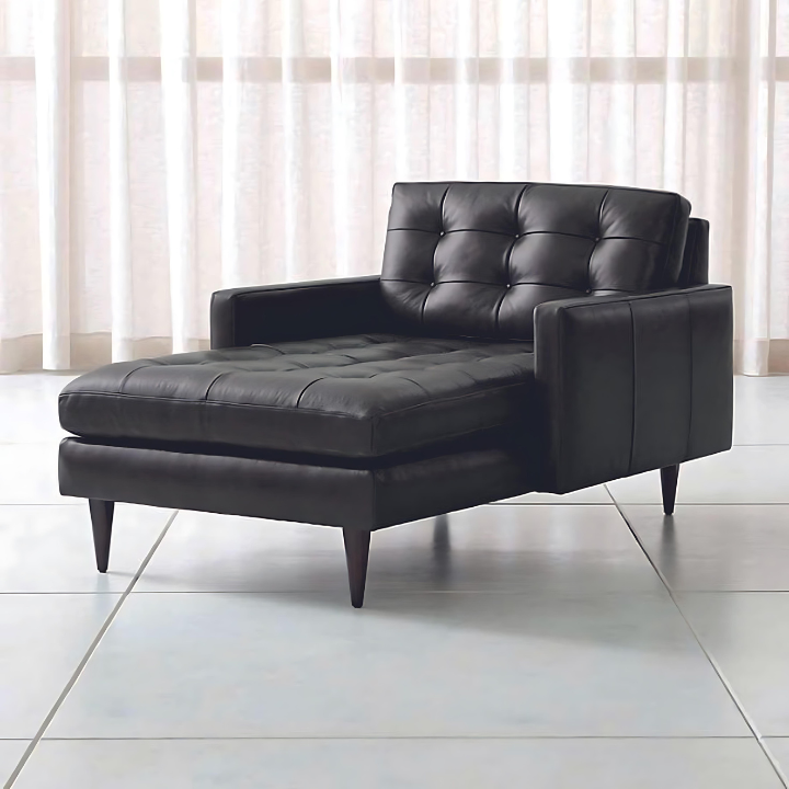 Metropolitan Black Lounge Chair – A sleek black leather chair with clean lines, tufted upholstery, and a low-profile design. Supported by sharp, angular legs, it blends comfort with modern elegance, making it an ideal fit for contemporary interiors.