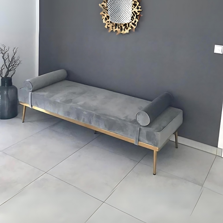 Modern Minimalist Daybed – A sleek grey velvet daybed with slender golden legs, offering the perfect blend of comfort, elegance, and contemporary style.
