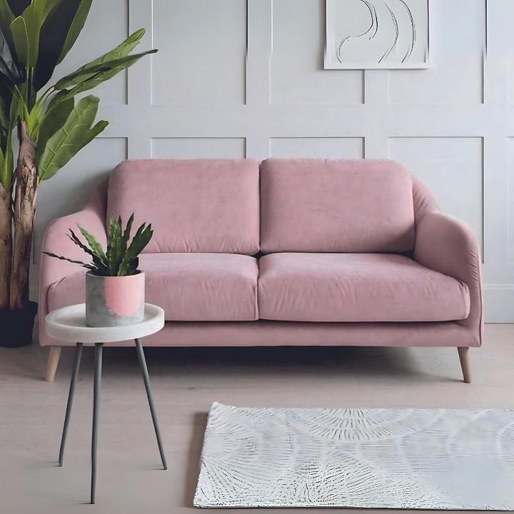 Blush Pink Luxe Sofa – A modern design in a delicate blush hue with plush fabric and minimalist wooden legs, offering both comfort and elegance for contemporary homes.