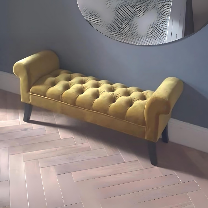 Citrine Chesterfield Bench – Featuring vibrant mustard velvet upholstery with classic tufting, this bench blends luxurious comfort with timeless style. Dark wooden legs add a modern twist, making it a standout statement piece for any refined space.