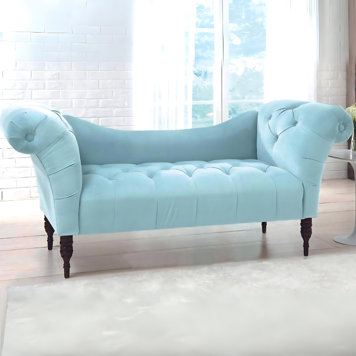 Serenity Scroll Chaise – Relax in timeless style with this mint-green tufted chaise. Featuring elegant scroll arms and classic wooden legs, it blends vintage charm with modern comfort for a soothing touch to any space.
