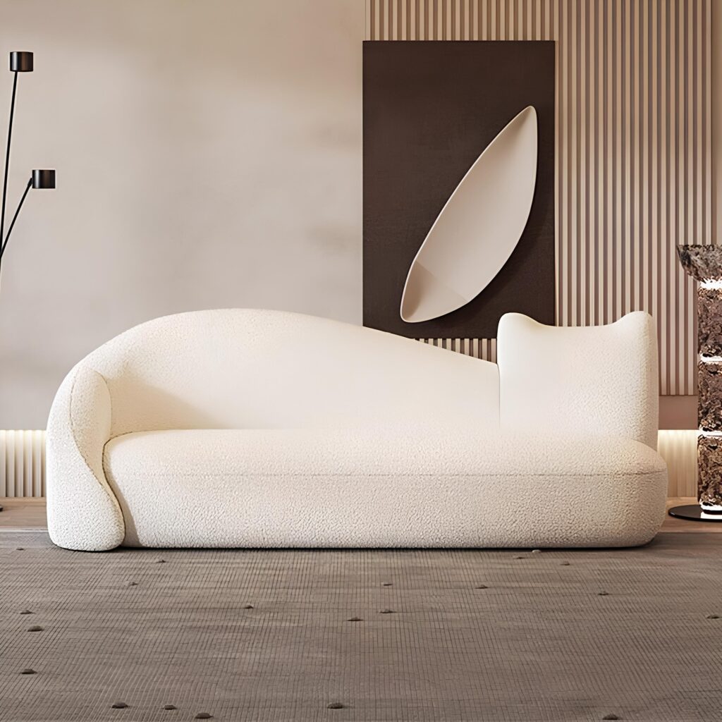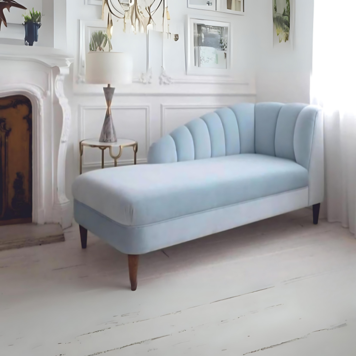 Celestial Wave Chaise – Featuring soft sky-blue upholstery, an elegant undulating backrest, and plush cushioning, this chaise blends modern minimalism with timeless comfort and subtle mid-century flair.