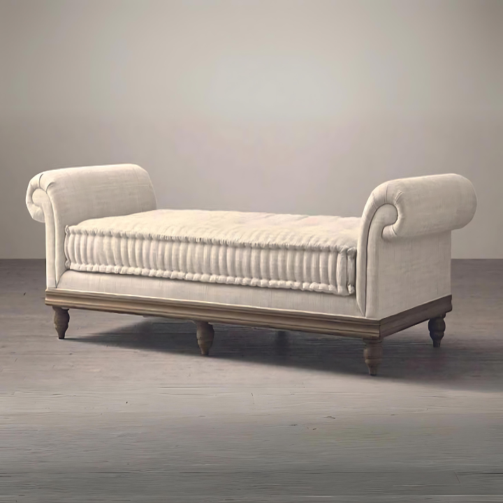 Tranquil Retreat Daybed – A timeless blend of comfort and elegance, featuring soft neutral fabric, tufted detailing, scrolled arms, and turned wooden legs. Perfect for adding classic charm to any living space.