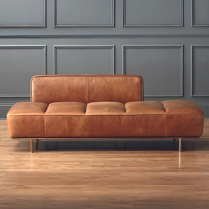 Rustic Luxe Leather Sofa – Crafted in rich caramel leather with plush cushioning and a sleek polished metal base. A timeless piece that blends rustic warmth with modern elegance.