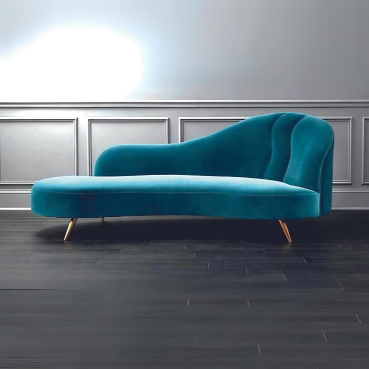 Aqua Serene Chaise Lounge – Upholstered in luxurious teal velvet, this chaise blends comfort and sophistication with a flowing wave-inspired silhouette. Supported by elegant golden tapered legs, it adds mid-century modern charm while offering the perfect escape to unwind in style.