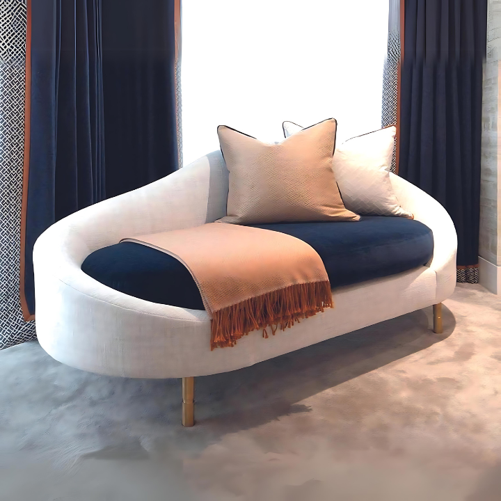 Modern Harmony Daybed – A sophisticated blend of light beige upholstery and deep navy cushioning, elevated by sleek curves and minimalist wooden legs. Contemporary elegance meets functional design for the perfect modern accent.