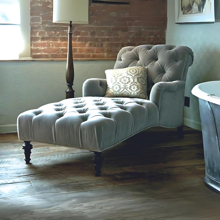 Vintage Elegance Chaise Lounge – Upholstered in plush grey fabric, this chaise showcases exquisite button tufting, a gracefully scrolled back, and nailhead trim for old-world charm. Supported by classic turned legs, it’s a timeless piece for those who value craftsmanship and style.